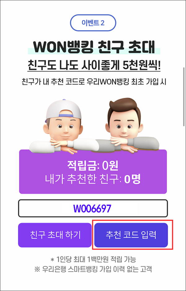 우리 원뱅킹 스마트뱅킹 친구추천 코드 W006697