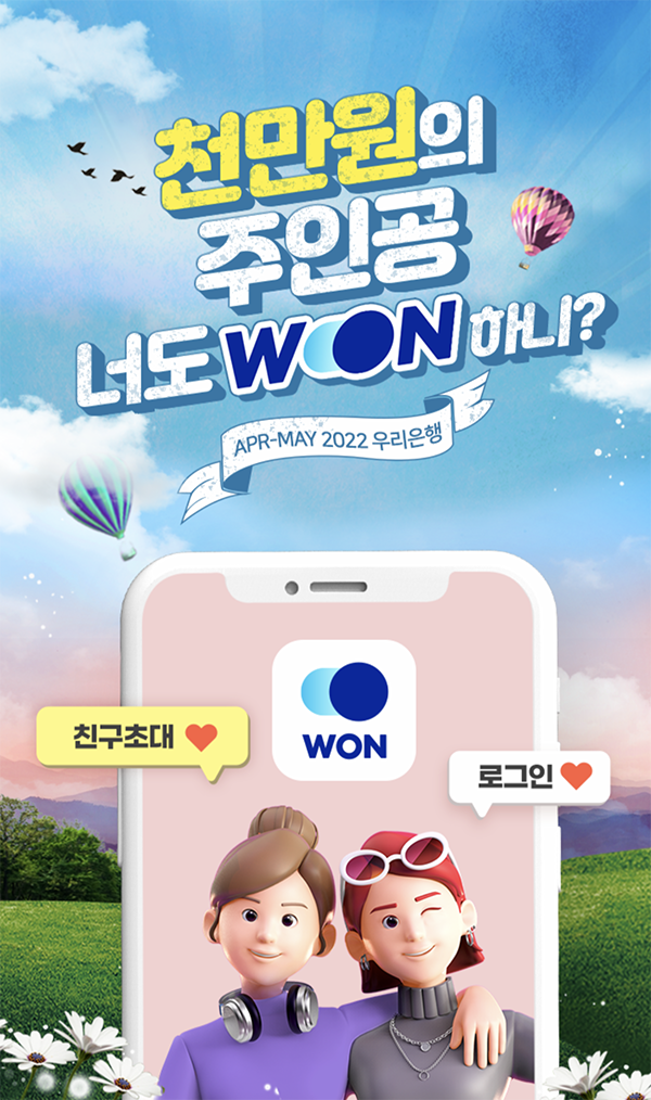 우리은행에서 스마트폰 앱 뱅킹 앱인 우리 원뱅킹 (WON)을 처음 가입하는 경우, 친구초대 쿠폰 코드 W006697을 입력하면 서로 5000원을 획득할 수 있는 이벤트를 하고 있다.