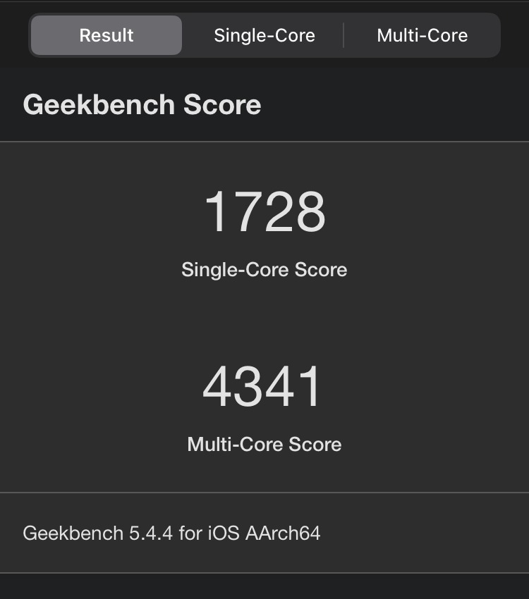 간단하게 긱벤치5로 체크해보니 싱글코어 1723점, 멀티코어 4341점, 메탈은 10760점!