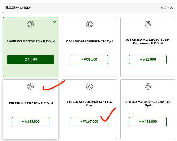 아무리 클라우드 서비스를 많이 쓴다고 해도, 저장공간은 1TB SSD가 있으면 참 편하더군요. 15만원이나 16만원 정도를 추가해서 1TB SD를 성능좋은 것으로 골라줍니다.