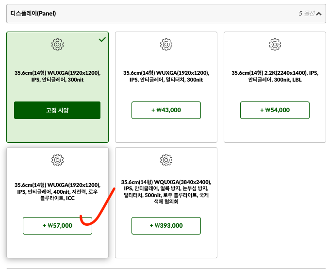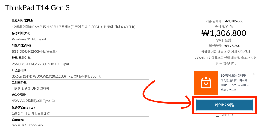 CTO 주문제작 모델을 구입하기 위해서는 일단 제품페이지에서 '커스터마이징' 버튼을 클릭합니다. 그 다음에 원하는 스펙을 추가하거나 제거하여 마음에 드는 노트북 사양을 만들수 있습니다.