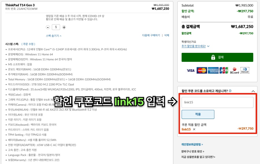 이렇게 구성하면 약 170만원 정도가 되는데요, 할인을 받을 수 있는 쿠폰코드 'link15'을 입력하면 더 저렴해 집니다. 최종가는 168만원 정도인데 나쁘지 않은 것 같네요 ^^