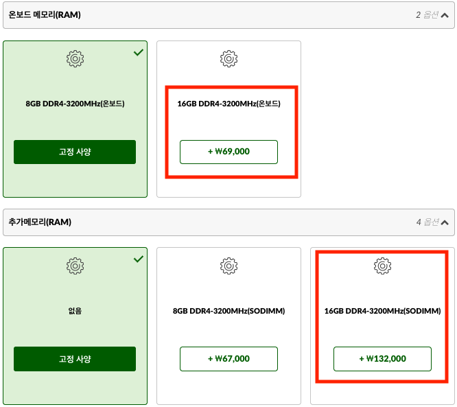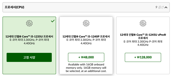 먼저 CPU 프로세서 입니다. 기본으로 인텔 12세대 엘더레이크 i5-1235U가 탑재되어 있는데, 성능이 조금 아쉬울 것 같더군요. 그래서 i5-1240P 프로세서로 4만 8천원을 추가해서 업그레이드를 합니다. CPU를 i5-1240P로 하면 기본으로 16GB 램이 들어가야 한다고 하네요. 그래서 밑에서도 온보드 램을 16GB로 선택해주어야 합니다.