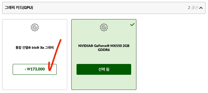 그래픽 카드입니다. 지포스MX550 외장그래픽이 기본으로 되어 있네요. 그냥 두어도 상관은 없지만 딱히 게임을 즐길 것이 아니라면 인텔 Xe 통합 그래픽도 상관없을 것 같아 -17만원을 절약해봅니다.