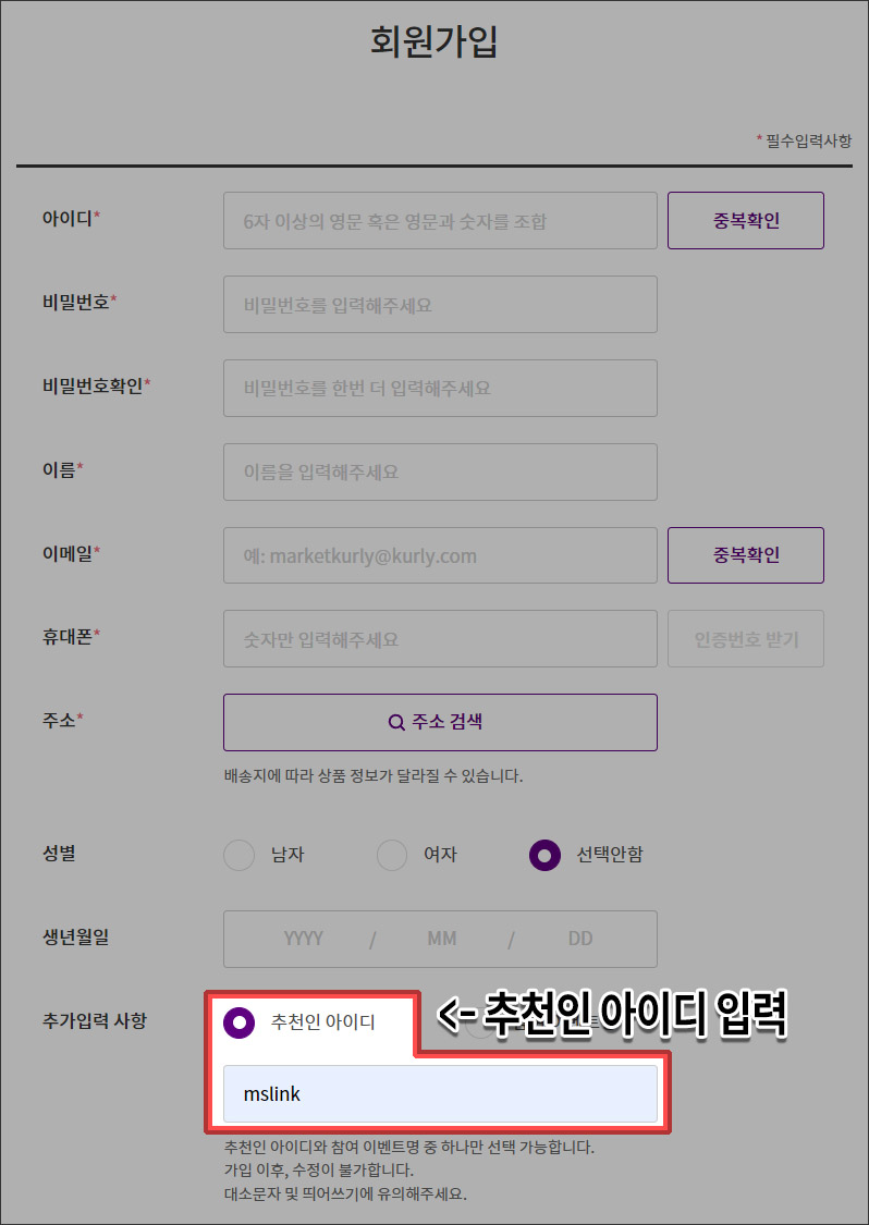 마켓컬리 가입하고 5000원 받는 방법 = 추천인 아이디 mslink 입력