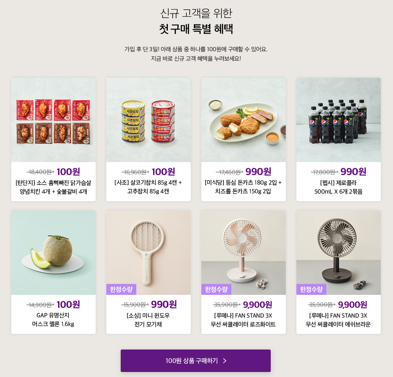 첫 구매 하실 때는 꼭 특별 상품 하나 선택하시는 것 잊지 마세요. 2022년 7월 기준으로 참치, 제로콜라, 돈카츠, 멜론, 그리고 루메나 선풍기 등등을 특가로 구입할 수 있네요.