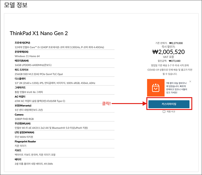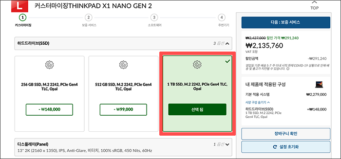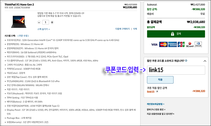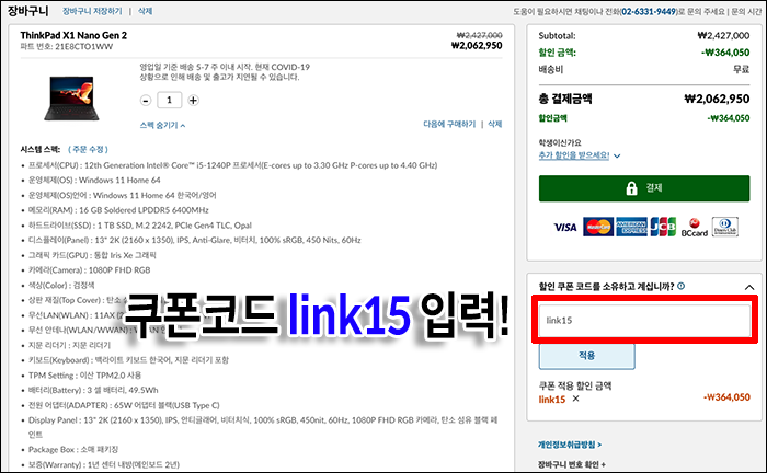 어찌되덨든 SSD를 1TB로 업그레이드한 씽크패드 X1 Nano 2세대 제품을 담고, 제가 알려드리는 특별 할인 쿠폰코드를 입력하니 추가할인이 되네요.