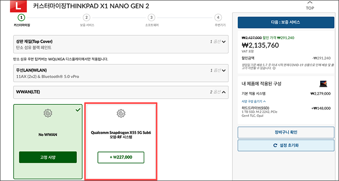 그리고 씽크패드 하면 역시 SIM카드(유심칩)를 넣고 쓸 수 있는 셀룰러 기능을 빼놓을 수 없죠. 출장을 자주 다니시는 분이나, 비즈니스 및 사무용 노트북을 구입할 때 고려되는 스펙인데요. 퀄컴 WWAN 기능을 추가하게 되면 22만원의 추가비용이 발생합니다. 그래도 5G 셀룰러는 매우 유용한 기능이기에, 꼭 필요한 비즈니스맨이라면 고려해보시기 바랍니다.