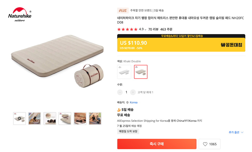 캠핑을 할 때 필요한 접이식 매트리스 입니다. 5일 빠른 배송이 되어서 더 메리트가 있어보이네요. 네이처하이크 좋아하시는 분들이라면 꼭 챙기시길!