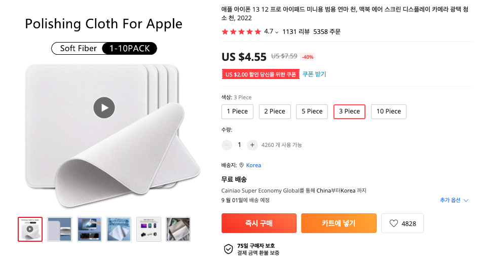 이 제품은 아이폰이나 아이패드, 맥북 등 스크린을 가진 제품을 깨끗하게 닦기 위해 있는 제품입니다. 3개를 사야 딱 무료배송이 되더군요 ㅎㅎ 가성비가 좋으니 장바구니에 담아두시는 것도 좋겠습니다.