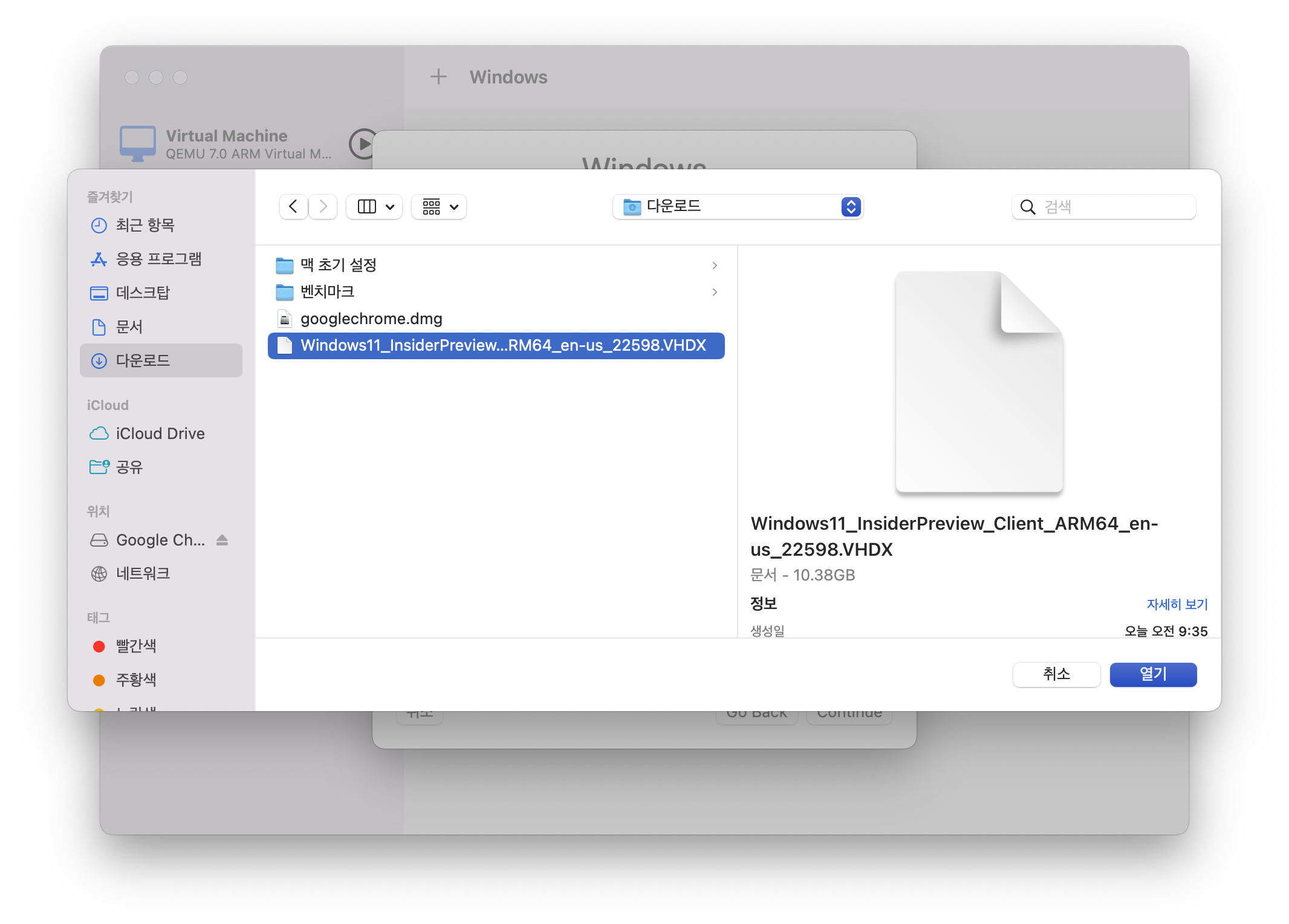 아까 그 화면에서 탐색을 눌러서 다운로드한 VHDX를 골라서 실행합니다.