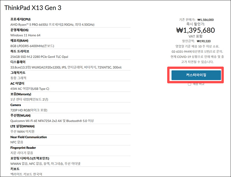 먼저 위에 링크를 통해 레노버 공홈에서 씽크패드 X13 모델을 검색하여 찾아 들어갑니다. 그러면 '커스터마이징' 버튼이 보이고 클릭합니다.