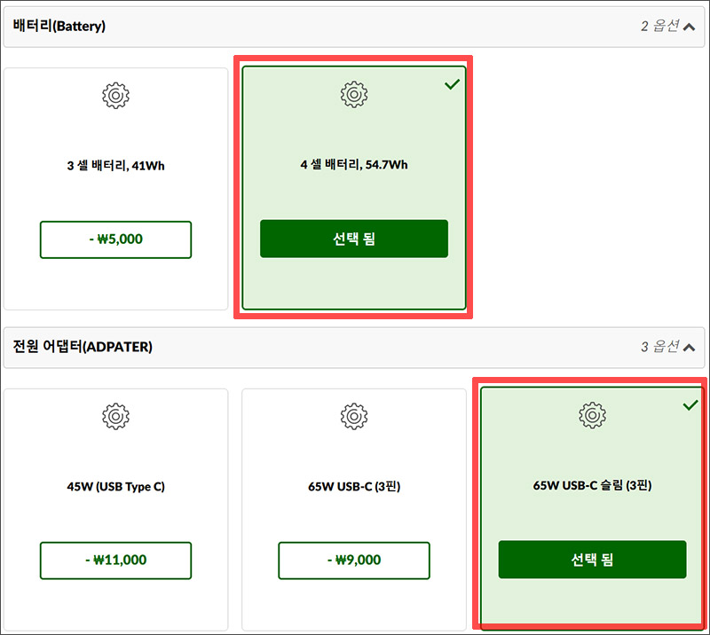 중요한게 또 하나 있었네요. 배터리의 경우 5000원만 추가하면 4셀 54.7Wh 배터리로 업그레이드가 가능합니다. 그리고 전원 어댑터도 11000원만 투자하면 65W 고속충전 슬림형 충전기로 바꿀 수 있네요.