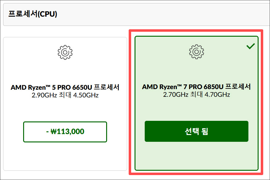먼저 제 경우네는 더 높은 성능을 원하기에 라이젠5 6650U 프로세서에서 라이젠7 6850U 프로세서로 11만 3천원을 더 투자해서 CPU를 업그레이드 하고, 램은 16GB로 유지, 스토리지는 512GB면 충분할 것 같아 SSD만 512GB로 6만원을 더해서 올렸습니다.