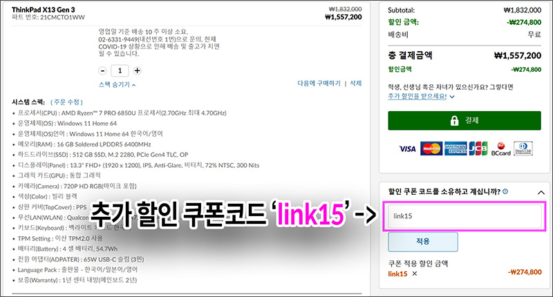 할인 쿠폰코드 link15를 입력해서 할인받아 저렴하게 구입하는 방법은 제가 가장 관심있어 하는 씽크패드 X13 3세대 AMD 라이젠 6650U, 6850U 탑재모델을 기준으로 소개해보겠습니다.