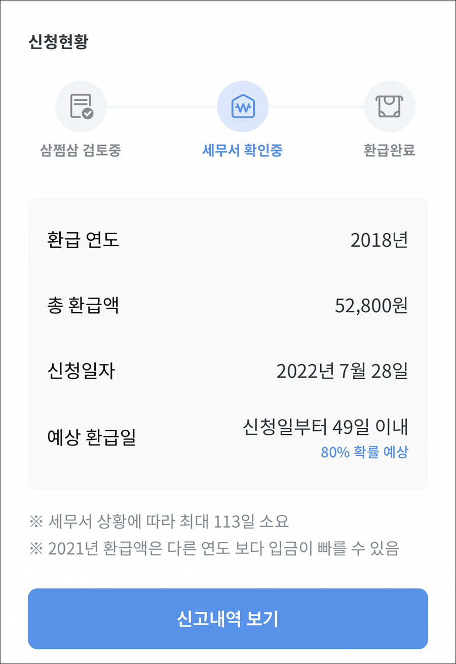 8월초에 신청한 것 같은데, 약 20일 정도 걸린 것 같네요. 52800원에서 수수료 4800원 정도가 빠지고 4만 8천원 입금을 받았습니다. 세금을 돌려받아서 그래도 좋네요 :)