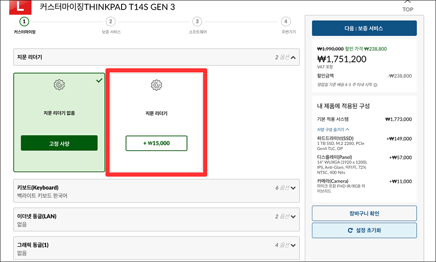 그리고... 여차하면 빼먹을 수 있는 지문 리더기도 필요하다면 추가하시기 바랍니다. 15,000원만 추가하면 되니까요 ^^ 평소 노트북을 잠금해제할 때 지문으로 하는 것이 편하다면 넣지 않을 이유가 없지요.