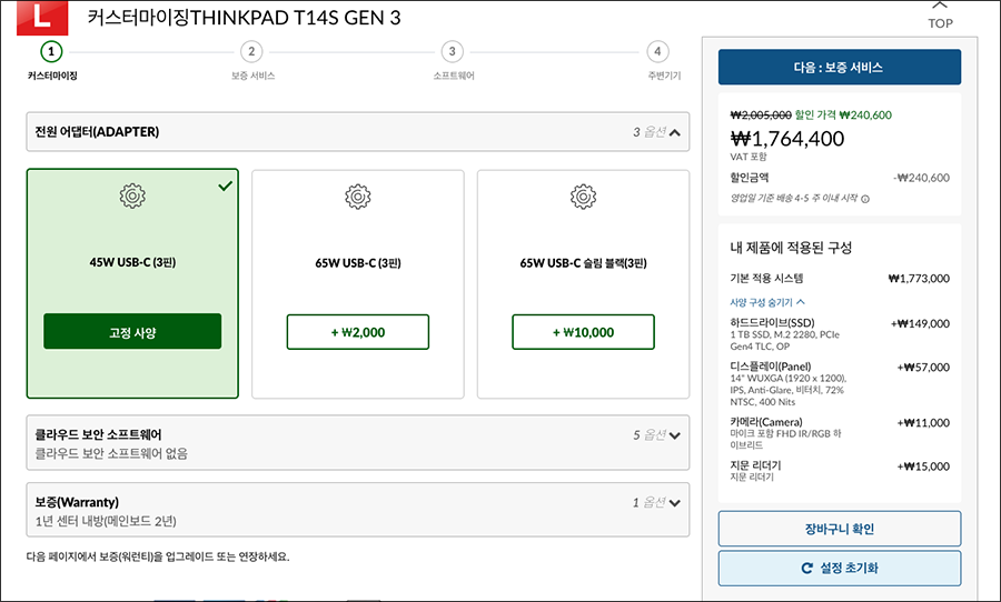 그러면 커스텀 주문으로 원하는 사양으로 업그레이드한 씽크패드 T14s 모델을 기본할인 + 추가할인 4만원을 더 할인 받을 수 있습니다. 결과적으로 쿠폰코드를 입력하면 구매할 떄 최대한 저렴하고 싸게 주문을 할 수 있죠.