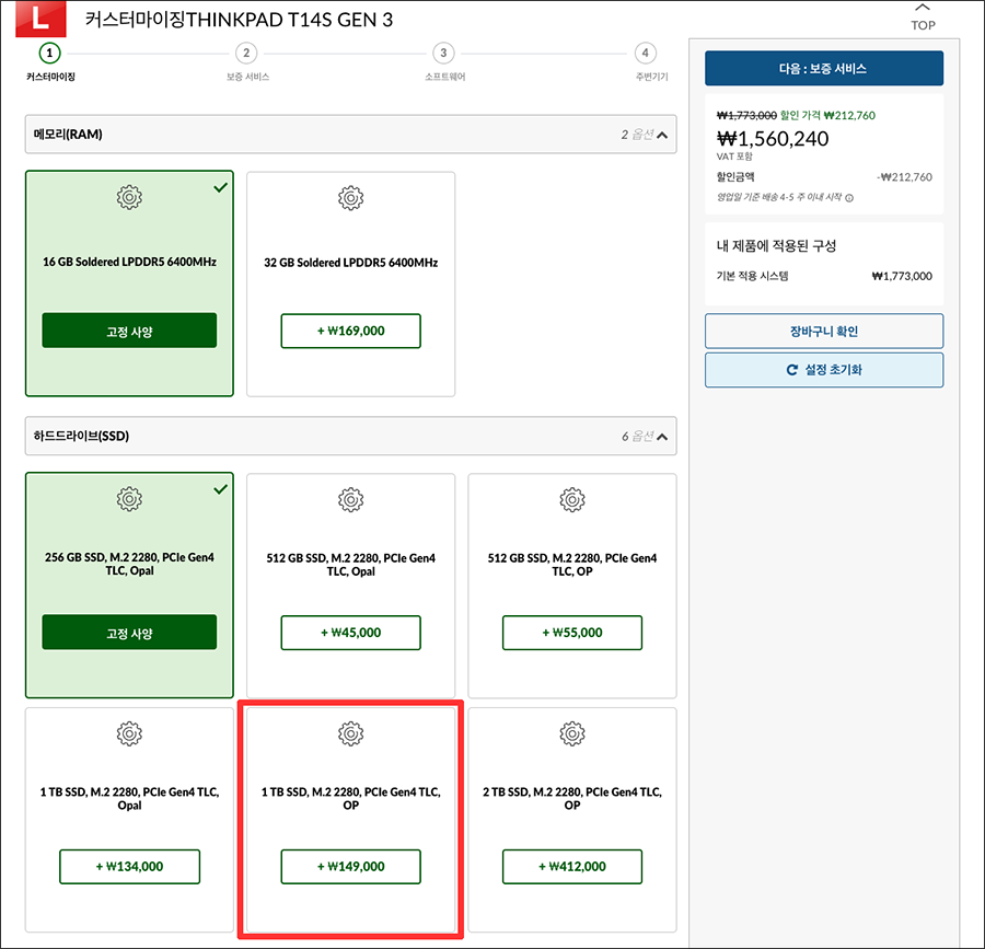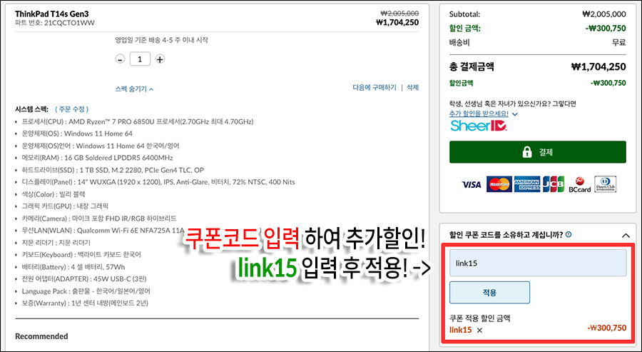 그러면 커스텀 주문으로 원하는 사양으로 업그레이드한 씽크패드 T14s 모델을 기본할인 + 추가할인 4만원을 더 할인 받을 수 있습니다. 결과적으로 쿠폰코드를 입력하면 구매할 떄 최대한 저렴하고 싸게 주문을 할 수 있죠.