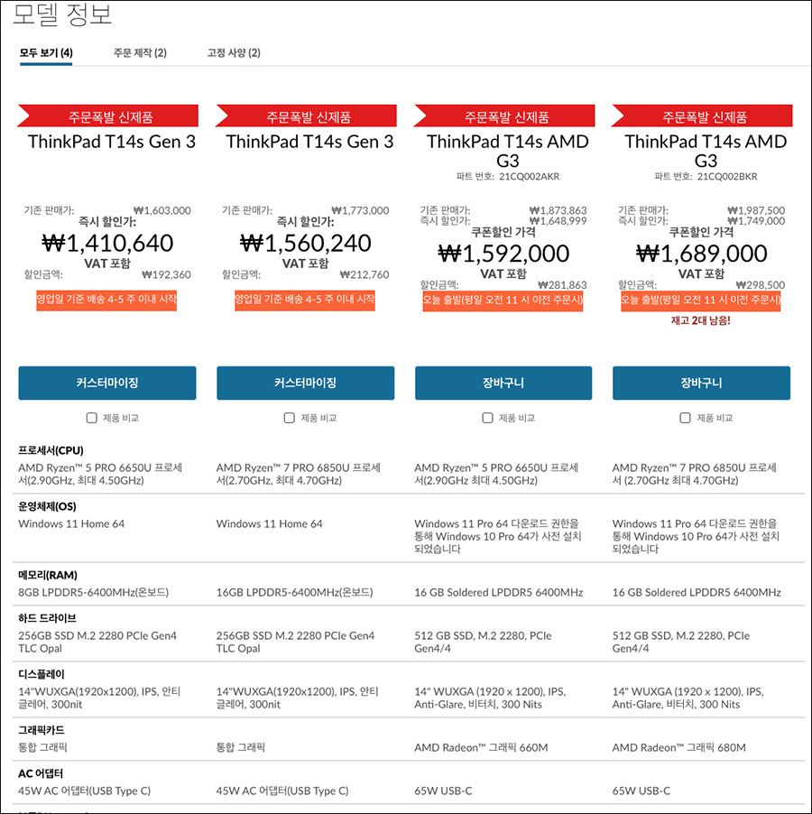 먼저 씽크패드 T14s 3세대 모델을 구입하기 위해 위에 사이트에 접속을 합니다. 그리고 커스터마이징이 가능한 모델을 선택하면 되는데요. 저는 일단 큰맘먹고 구입하는 노트북이라면 라이젠5가 아닌 라이젠7 6850U 모델을 추천해봅니다. 해당 모델 '커스터마이징' 버튼을 눌러서 진행을 해보면...