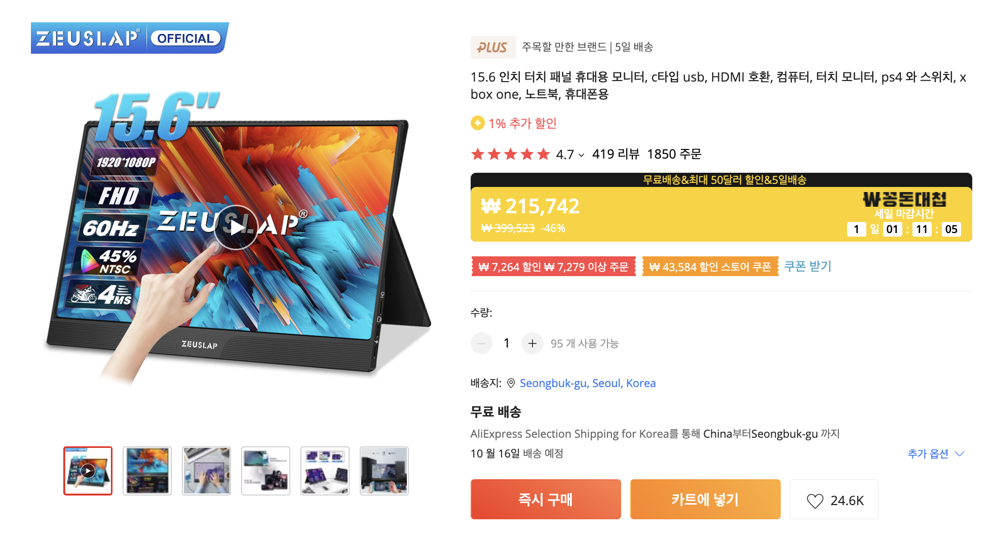 외장 모니터를 찾으신다면 제우스랩 휴대용 15.6인치 터치 모니터가 있습니다. 다중 작업이 필요하신 분들이라면 하나 구입하면 매우 요긴하게 쓸 수 있죠.