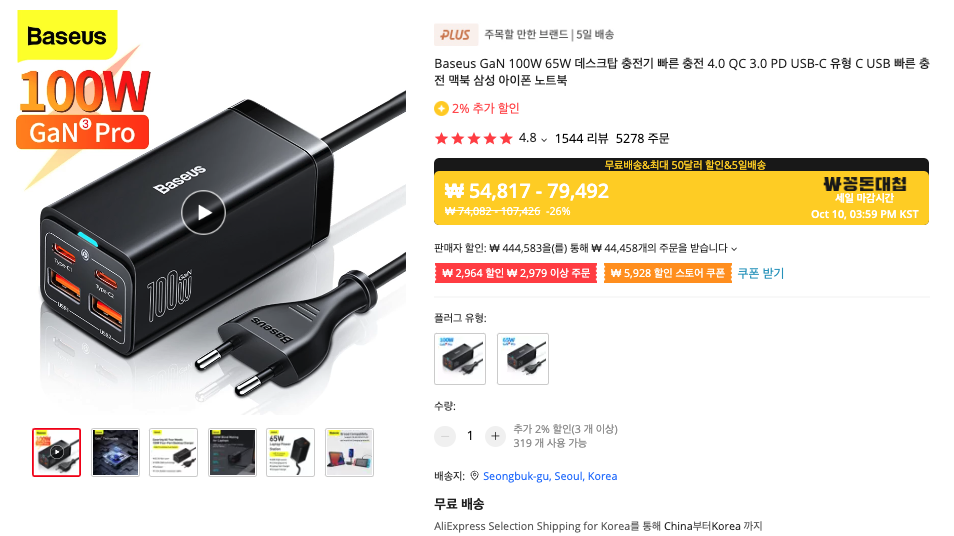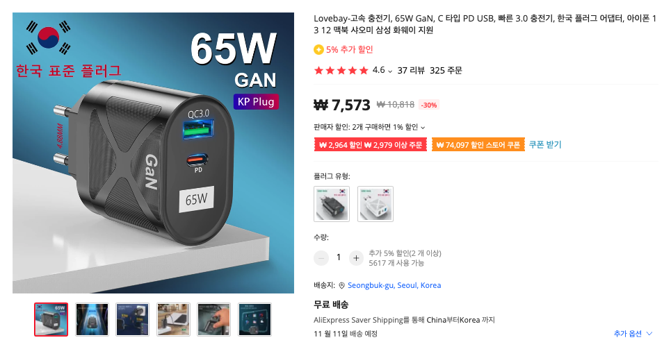 가장 먼저 65W USB PD 고속 충전기 입니다. USB PD를 지원하는 노트북을 고속 충전할 수 있는데 굉장히 저렴하게 나왔고, 무엇보다도 한국식 플러그라서 EU처럼 헐겁지 않은 플러그 핏이라 메리트가 있습니다.