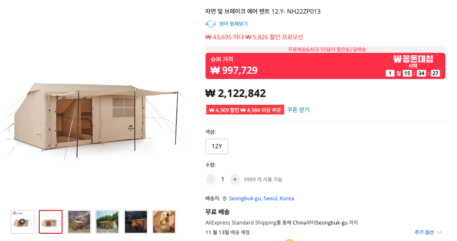 캠핑용품인 네이처하이크 텐트 입니다. 이 제품은 관부가세 포함이라서 안심하고 구입해도 된다고 쓰여져 있네요. 파격 할인 가격대라서, 카드사 할인과 쿠폰코드를 적용하면 더 저렴해질 것 같습니다.