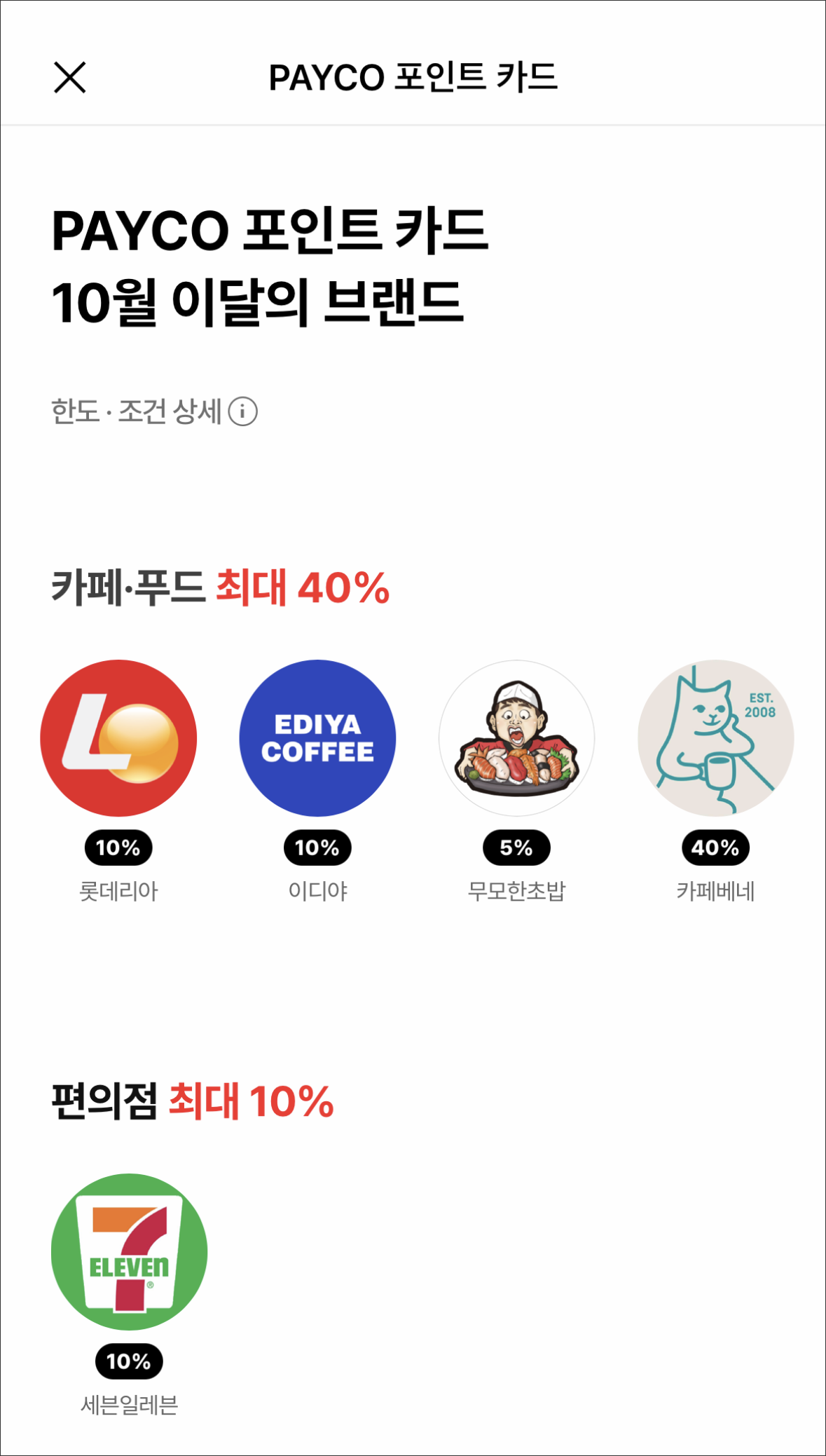 다만 일별 최대적립 상한선이 각각 있으니 사용하기 전에 해당 월의 브랜드 적립조건을 잘 챙기면서 써야 효율이 좋은 카드인 것 같습니다. 아무튼 사용하기에 따라서 페이코 포인트를 팍팍 모을 수 있을 것 같아서 유용해보이네요.