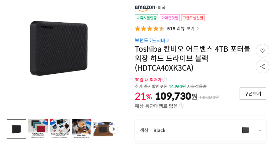 제가 이번에 추천하고자 하는 외장하드는 아래와 같습니다. 11번가 아마존 (11마존)에서 구입할 수 있는 상품입니다.