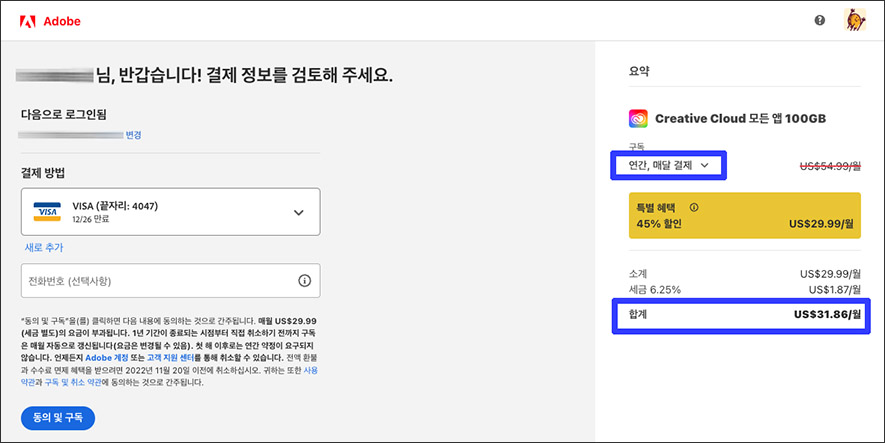실제로 구독을 진행해보면 매달 31.86$ 정도가 결제가 되는 것을 알 수 있습니다. 평소에는 한번에 큰 돈을 결제하는 것이 부담스럽기 때문에 연간, 매달 결제 옵션을 주로 추천해드렸는데, 최근에 달러가 많이 올라갔고, 또 앞으로도 더 오를 가능성이 있죠.