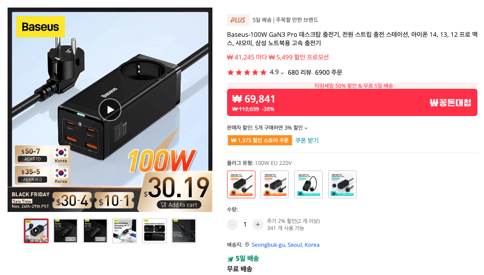 :: Baseus 100W 접지 연장선 플러그 USB PD 멀티 충전기 구입하기 ::