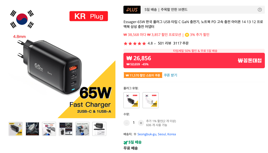 요즘은 알리에서 사는 충전기도 한국형 플러그로 잘 나오는데요. 위에 제품이 바로 효자 상품입니다. 65W로 노트북도 고속 충전기 가능하고, 한국 플러그에 딱 맞기에 만족도도 매우 좋은 제품입니다.