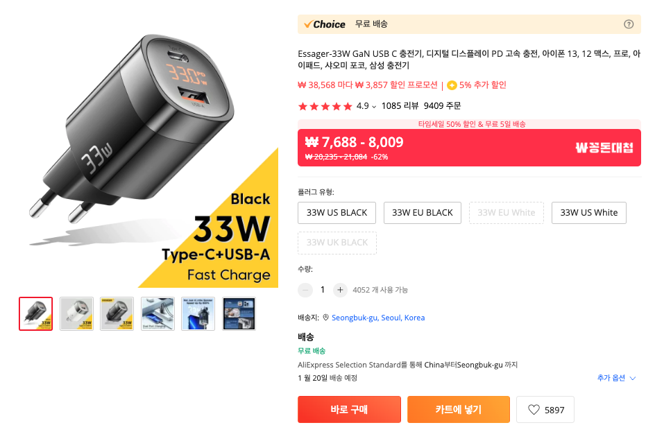 제가 사용해본 USB PD 충전기중 가장 가성비가 좋은 에세저 (Essager) 33W 충전 어댑터 입니다. 유럽형 (EU) 플러그를 선택하면 크게 불편하지 않죠. 만약 살짝 헐거운 것이 걱정이 되신다면 일부러 US 플러그를 사고 앞에 어댑터를 끼우는 형태로 사용해도 가격이 저렴하고 성능이 좋아 이득을 본 느낌입니다. 아이패드나 맥북에어를 충전하는데 적합한 녀석이죠.