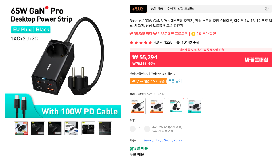 USB PD 고출력 멀티 충전기는 여러개가 있지만, 역시 그 중에 베스트셀러는 베이스어스 제품인 것 같습니다. 100W 제품은 출력이 높아서 추천할만하지만 살짝 가격이 높고, 65W 출력 제품은 가격도 상대적으로 저렴한 편이고 5V 낮은 출력 포트도 있어서 더 추천드리는 편입니다. 이 제품은 EU플러그라고 되어 있지만 실제로는 한국형 플러그이고, 접지에다가 전기선 연장선으로도 사용할 수 있어서 하나쯤 꼭 구입해두면 두고두고 유용하게 쓰는 아이템이죠.
