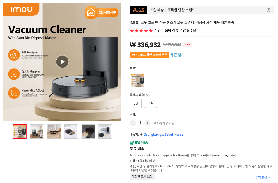 도킹 스테이션이 있어서 자동으로 먼지함도 비워주는 이모우(IMOU) 로봇청소기 입니다. 이모우 제품은 한국 유저들의 인정을 받은 제품이라서 그런지 한국형 플러그로도 나옵니다. 플러그 유형을 KR로 선택하시면 됩니다. :)