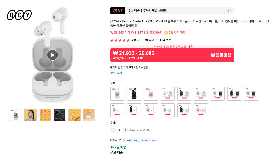 가성비가 매우 좋기로 유명한 QCY 완전무선 이어폰입니다. 비싼 제품을 선호하는 것이 아니라면 매우 훌륭한 음질을 들려주는 제품이죠. 저도 이번에 2개 구입했습니다. 이어폰을 필요로 하는 분들께 선물용으로도 좋아요.
