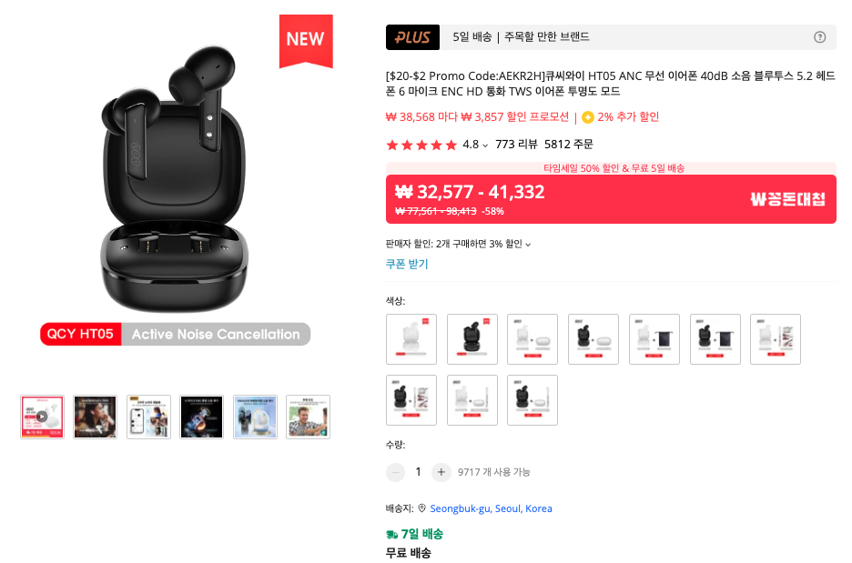 액티브 노이즈 캔슬링이 되고 수준 높은 음질이 필요하다면 신형 제품인 QCY HT05도 고려해볼만 합니다. 에어팟과 비교하면 1/5가격이지만, ANC를 지원하니 가성비는 정말 최고라고 할 수 있죠.