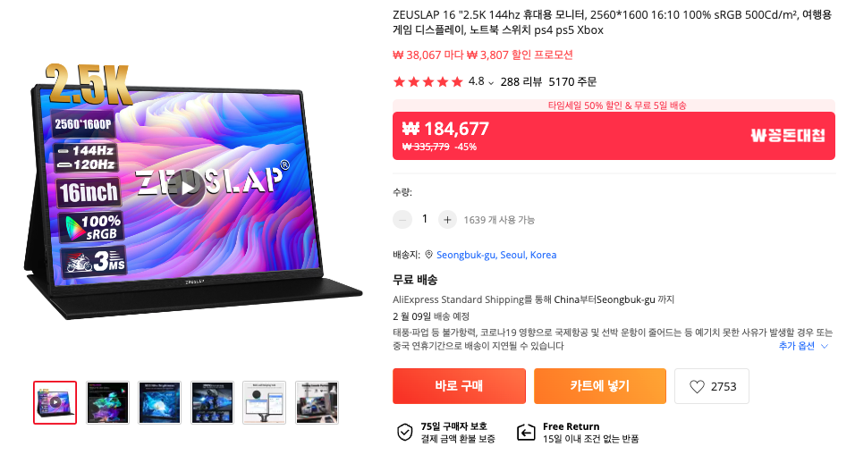 가장 먼저 16인치 휴대용 모니터인 제우스랩 제품입니다. 인기가 매우 좋고, 가성비가 좋기로 유명한 제품이죠.