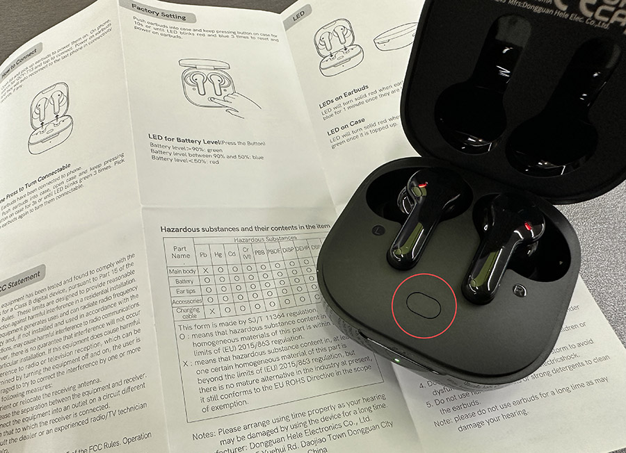 메뉴얼을 잘 안 읽는 편인데, 충전 제스처를 확인하려고 읽다보니 안쪽에 있는 스위치는 충전량을 체크하기 위한 버튼이었네요. 누르면 불이 케이스에 불이 들어오는데, 컬러를 통해 몇% 충전량이 있는지를 확인할 수 있습니다.