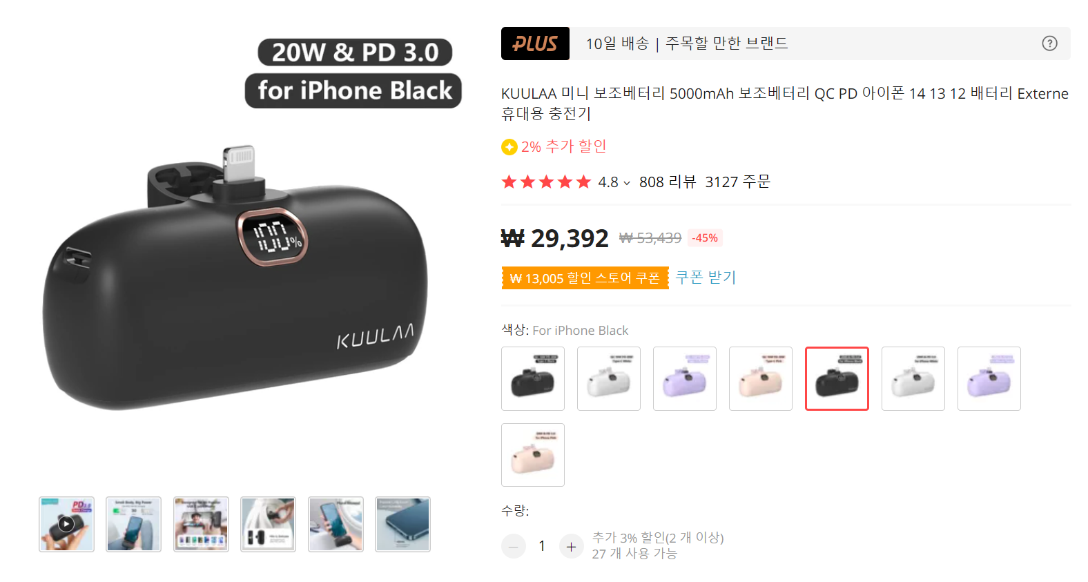 사용하고 있는 스마트폰의 케이스가 두꺼워서 무선 보조배터리는 쓰기 어렵고, 사용하기 편한 휴대용 보조배터리가 필요하다면 눈여겨 볼만한 Kuulaa의 보조배터리입니다. 아이폰 안드로이드용 제품이 따로 있고, 고속충전을 지원해서 좋네요. 또한 잔량을 디지털 숫자로 표기해줘서 좋구요.