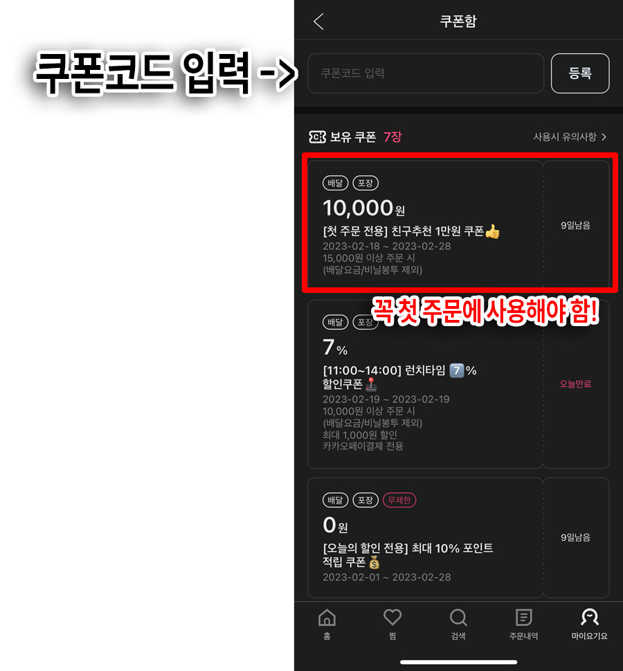 위와 같은 굉장히 까다로운 조건을 모두 만족시켰다면 첫주문 쿠폰을 등록하기 위해 '마이요기요' 탭으로 가서 '쿠폰함'으로 이동한 다음, 가장 상단에 보이는 '쿠폰코드 입력'란에 아래의 쿠폰코드를 입력하면 됩니다.
