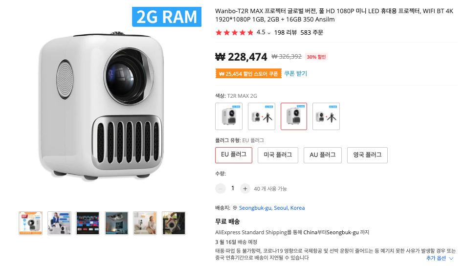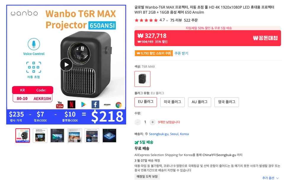 Wanbo T6R Max 모델은 인기가 좋아서 그런지 재고도 몇개 없는 것 같습니다. EU플러그 모델을 구입하실 거라면 빨리 구입하시는 것이 좋을 것 같네요.