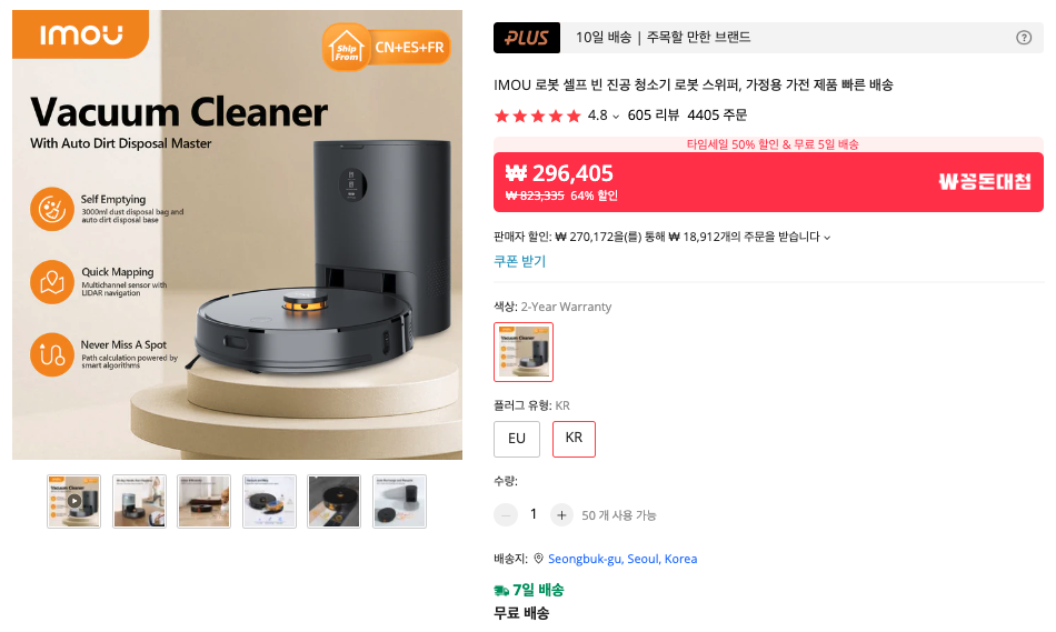 가장 먼저 추천하는 것은 이모우 (IMOU) 로봇청소기 입니다. KR로 선택하면 한국 음성으로 나오는 모델을 구입할 수 있습니다. 라이다가 탑재되어 있어서 스마트하기도 하고, 먼지함을 비우기도 편리한 모델이죠. 중국 대기업 제품이라서 만족도도 매우 큽니다.