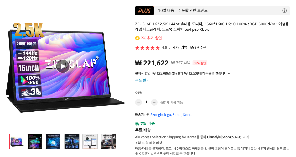그 다음으로는 제우스랩 16인치 휴대용 모니터가 있습니다. 144hz와 16:10 비율, 2560x1600 해상도로 인기가 매우 좋은 제품입니다.