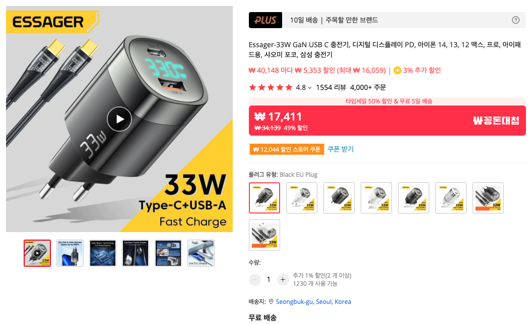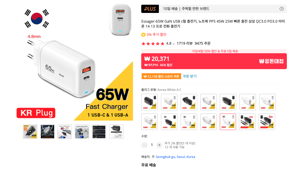 충전 어댑터는 USB PD를 지원하는 65W 제품 중 Essager 충전기가 매우 좋습니다. 알리익스프레스에서 파는 충전기이지만, KR (한국형) 플러그도 팔고 있습니다.