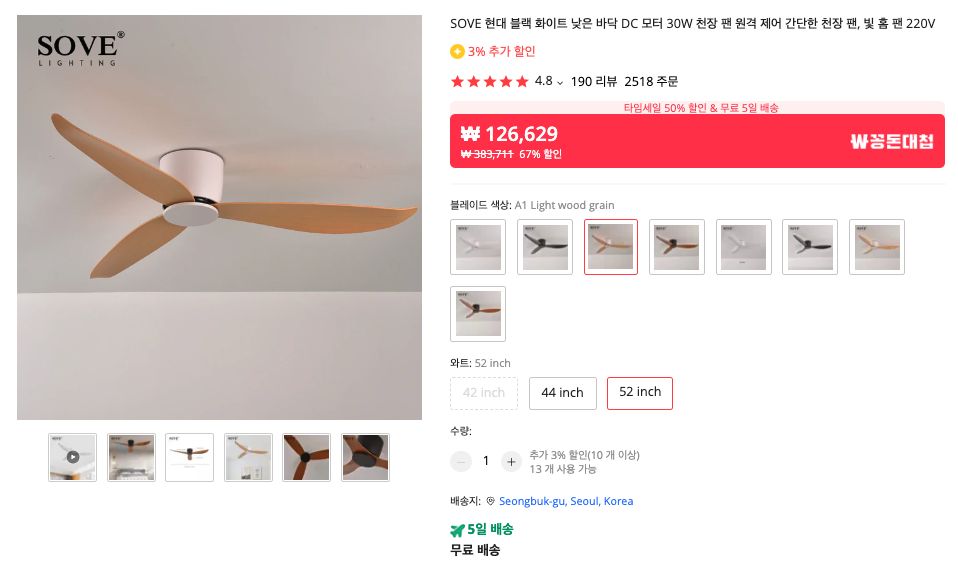 천정에 다는 SOVE(소베) 실링팬 입니다. 역시 가격이 좋고 디자인 예뻐서 잘 팔리는 제품이라고 하네요.