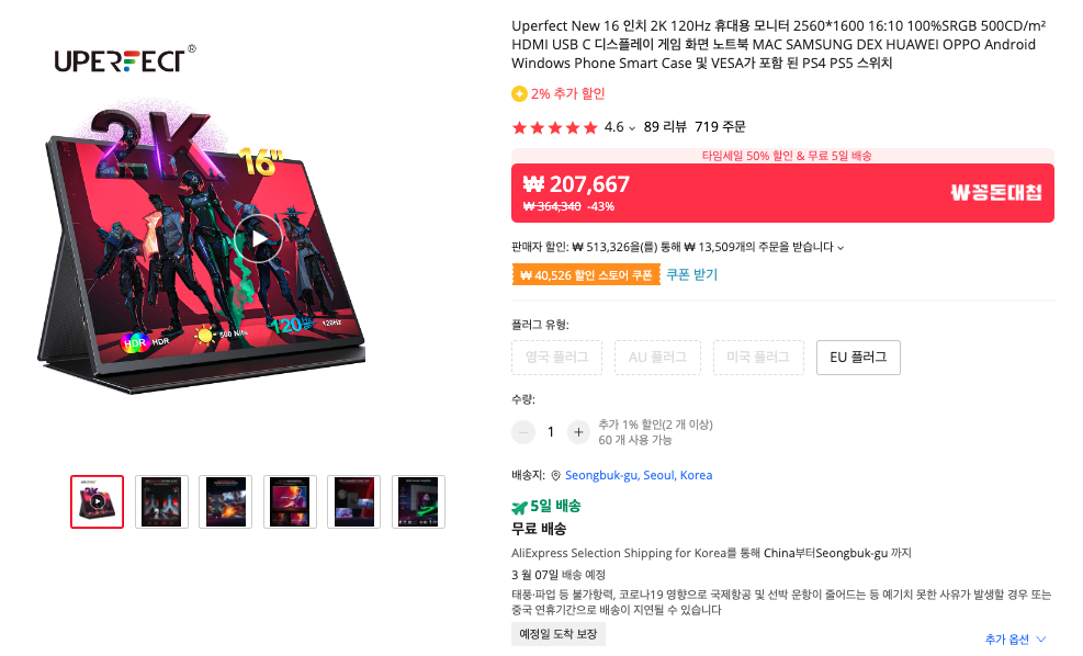 이어서 휴대용 모니터하면 최근 인기 있는 Uperfect 모델도 있습니다.