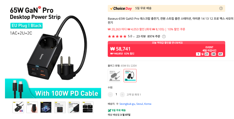 Baseus 베이스어스를 아신다면 꼭 하나쯤은 구입해야 하는 65W 멀티충전기 입니다. 이 제품은 EU플러그라고 되어 있지만, 실제로 구입해보면 한국형 플러그이고 접지까지 설계되어 있습니다. ^^