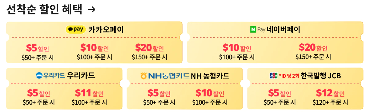 카카오페이랑 네이버페이 모두 각각 최대 20$ 할인이 되네요. 150$ 이상 결제할 때니까 여러개를 장바구니에 넣어두고 필요한 물품을 구입하면 되겠습니다. 개인적으로 우리카드 100달러 이상 결제시 11$ 할인이 꽤 마음에 드는군요.