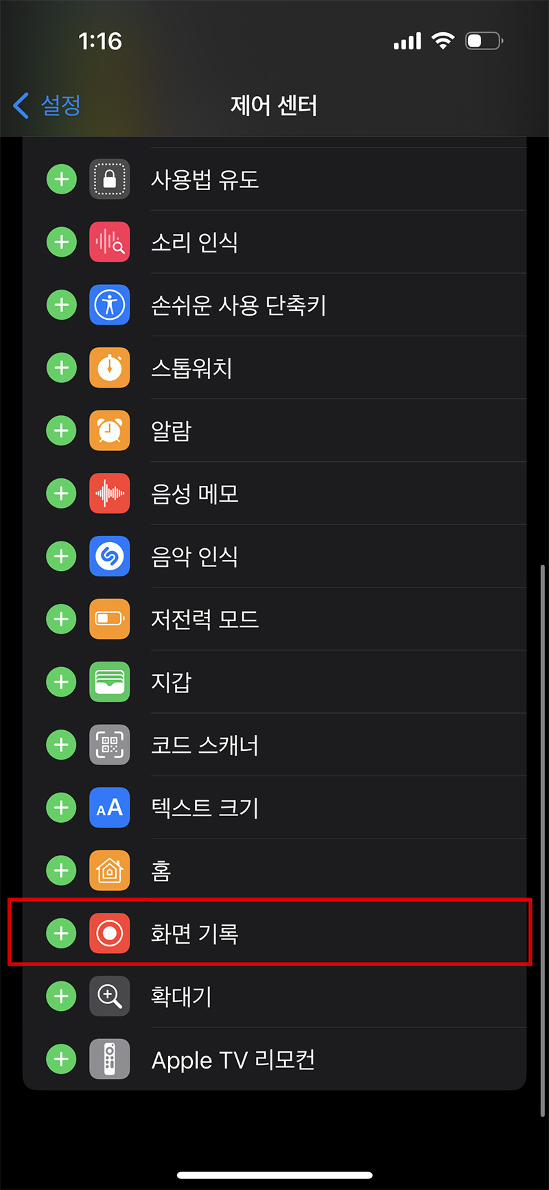 이럴때는 설정 앱을 들어가서, 제어 센터로 간 다음, 리스트에서 '화면 기록'을 찾아 +를 눌러서 추가해주시면 됩니다.